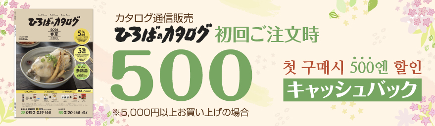 今、「ひろばのカタログ」で新規に5,000円以上お買い上げのお客様にもれなく500ポイント(1ポイント=1円)をさしあげております。